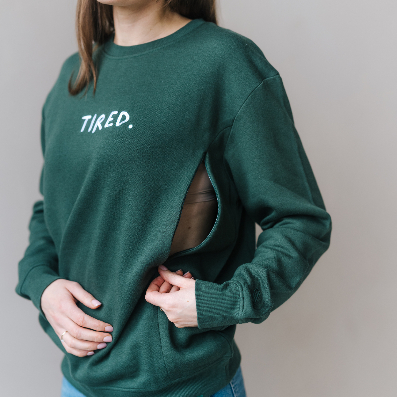Vår amningssweatshirt är tillverkad av en ultramjuk bambu-bomullsblandning med en fleeceinsida som andas och ger komfort under alla stadier av moderskapet.